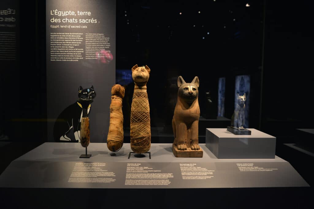 L’exposition présente une reconstitution de la « sépulture au chat » de Shillourokambos, à Chypre. Vieille de 9 500 ans et découverte en 2002, la tombe abrite un jeune homme et un chat domestique. C’est l’une des plus anciennes traces de cette relation spéciale entre le chat et l’humain, qui témoigne de liens affectifs entre les deux espèces.