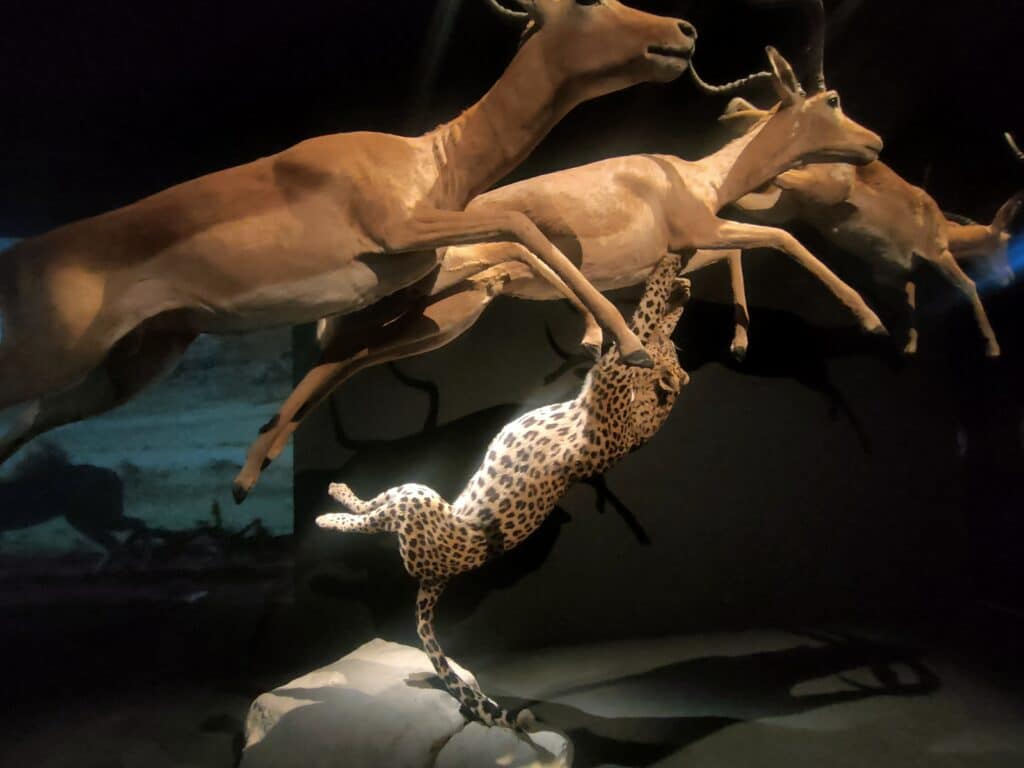 La déambulation dans l’exposition permet de mieux connaître ces mammifères poilus qui nous subjuguent grâce à des animaux naturalisés, une scénographie impressionnante, ou encore des bornes interactives pour comprendre pourquoi les félins sont de bons chasseurs, quels sens ils utilisent, quelles sont leurs qualités athlétiques pour courir, sauter et s’emparer de leurs proies. C’est un trait commun à toutes les espèces de félin.