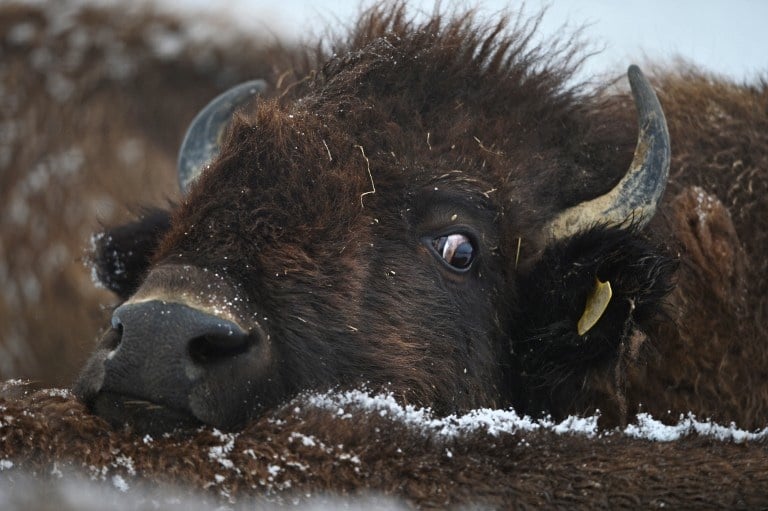 Erlenmoos, Allemagne : un bison repose sa tête sur le dos d’un autre bison près d’Erlenmoos au sud de l’Allemagne. © AFP PHOTO / FELIX KAESTLE GERMANY OUT