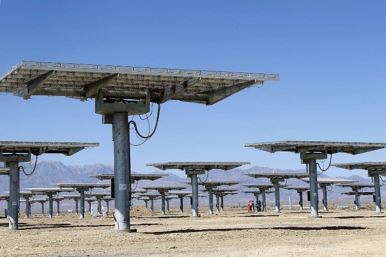 Staff of a solar power plant works on their solar panels in Hami, northwest China's Xinjiang Uygur Autonomous Region on May 8, 2013. The EU executive on May 8 proposed heavy anti-dumping tariffs of around 47 percent on imports of Chinese solar panels, a European Union source said. CHINA OUT AFP PHOTO