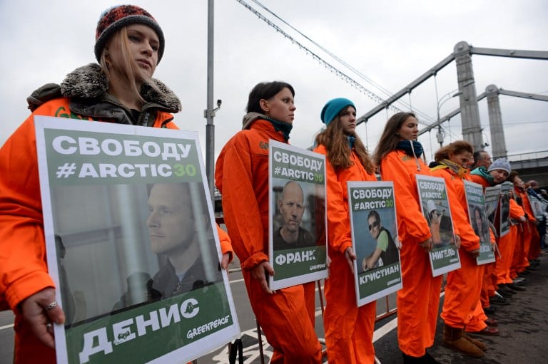 Greenpeace activists holds posters with pictures of the "Artic 30" detained Greenpeace activists as they demonstrate in Moscow, on October 18, 2013. The the "Arctic 30" are now in custody in Russian northern Murmansk region charged with on piracy charges for almost three weeks after their ship Arctic Sunrise was seized by Russian security forces after a protest at a Russian oil rig. AFP PHOTO / KIRILL KUDRYAVTSEV