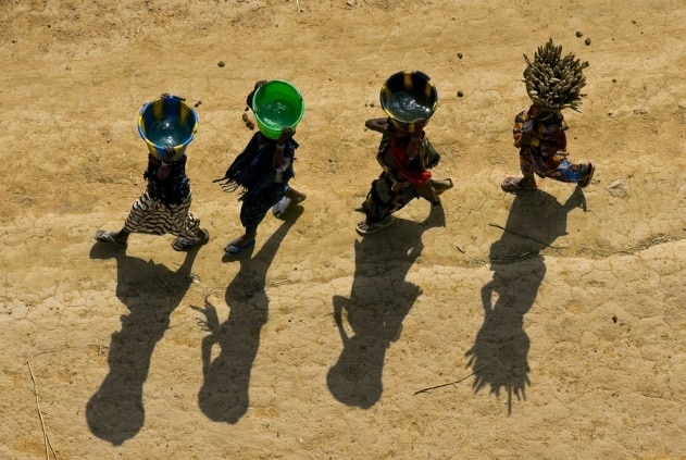Jeunes filles portant des seaux en pays dogon près de Bandiagara, Mali (14°20’ N – 3°37’ O). © Yann Arthus Bertrand