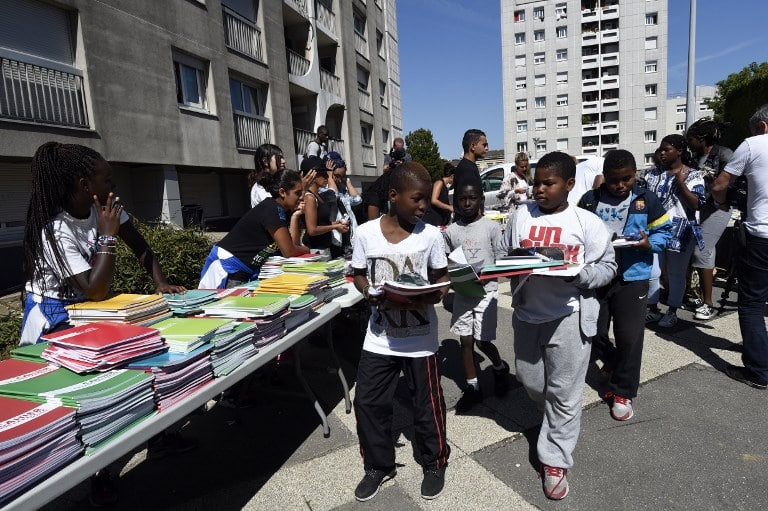 Des enfants reçoivent des fournitures lors de l'opération "Rentrée pour tous" le 29 août 2015 à Aubervilliers. © AFP PHOTO / MIGUEL MEDINA