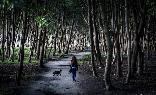 A woman walks her dog in the forest near the village of Yantarny, some 40 km outside Kaliningrad on August 28, 2017. - Kaliningrad will host several football matches as part of the FIFA World Cup 2018 that will be held from June 14 to July 15, 2018 in Russia. (Photo by Mladen ANTONOV / AFP)
