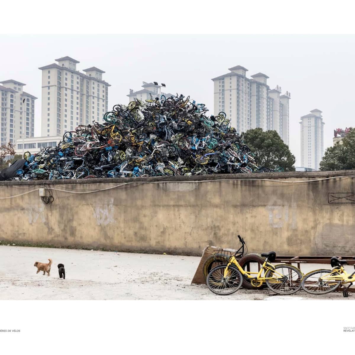 Le photographe Wu Guoyong témoigne avec son travail de la face cachée des vélos en libre-service en Chine : « au début, les vélos partagés ont été accueillis très favorablement par la population. Mais cela n’a pas duré longtemps. Les utilisateurs se garaient n’importe où, ils abandonnaient leurs vélos sur les trottoirs et à l’entrée des appartements. Les autorités ont été forcées d’intervenir et ont déplacé des millions de vélos vers les cimetières à vélos ». En janvier 2018, il s’est mis à traquer et visiter une quarantaine de cimetières de vélos en libre-service dans son pays. À l’aide d’un drone, le photographe chinois est parvenu à montrer l’ampleur du phénomène et du gâchis.