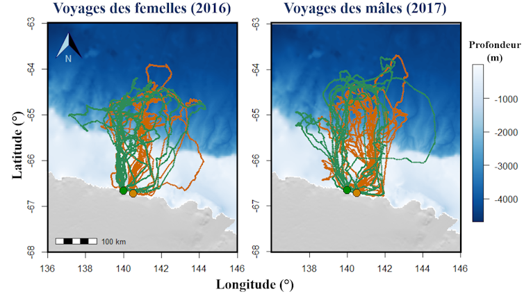Nos résultats ont mis en évidence que les manchots des deux colonies, aussi bien femelles que mâles, n’auraient pas tiré avantage des proches accès à l’eau afin de se nourrir. Ils se sont à la place alimentés au niveau de la lointaine bordure de glace, et ce malgré la longue distance à parcourir.