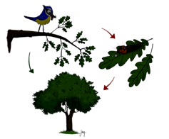 Prenons une forêt par exemple. Tu y trouves des arbres, avec des feuilles, et sur ces feuilles des chenilles. Tu entends aussi des oiseaux, des mésanges par exemple. Les mésanges mangent les chenilles. Les chenilles mangent les feuilles. À l’automne, les feuilles tombent. Les cloportes, les champignons et les vers de terre décomposent les feuilles – on les qualifie de « décomposeurs ». Toute la matière qui constituait la feuille est alors progressivement incorporée dans le corps des décomposeurs, ou libérée dans le sol. Elle devient alors réutilisable pour l’arbre qui produira de nouvelles feuilles l’année suivante, feuilles qui nourriront de nouvelles chenilles, qui elles-mêmes nourriront de nouvelles mésanges et ainsi de suite. C’est aussi ça la biodiversité : des interactions entre les êtres vivants qui sont à l’origine du fonctionnement des écosystèmes.