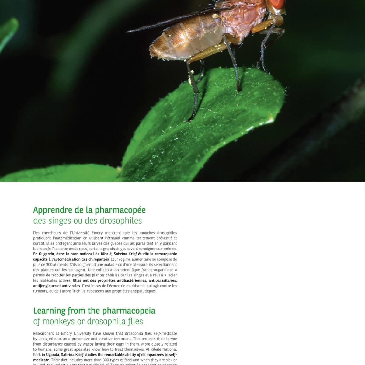 Des chercheurs de l’Université Emory montrent que les mouches drosophiles pratiquent l’automédication en utilisant l’éthanol comme traitement préventif et curatif. Elles protègent ainsi leurs larves des guêpes qui les parasitent en y pondant leurs œufs. Plus proches de nous, certains grands singes savent se soigner eux-mêmes. En Ouganda, dans le parc national de Kibalé, Sabrina Krief étudie la remarquable capacité à l’automédication des chimpanzés. Leur régime alimentaire se compose de plus de 300 aliments. S’ils souffrent d’une maladie ou d’une blessure, ils sélectionnent des plantes qui les soulagent. Une collaboration scientifique franco-ougandaise a permis de récolter les parties des plantes choisies par les singes et a réussi à isoler les molécules actives. Elles ont des propriétés antibactériennes, antiparasitaires, antifongiques et antivirales. C’est le cas de l’écorce de markhamia qui agit contre les tumeurs, ou de l’arbre Trichilia rubescens aux propriétés antipaludiques.