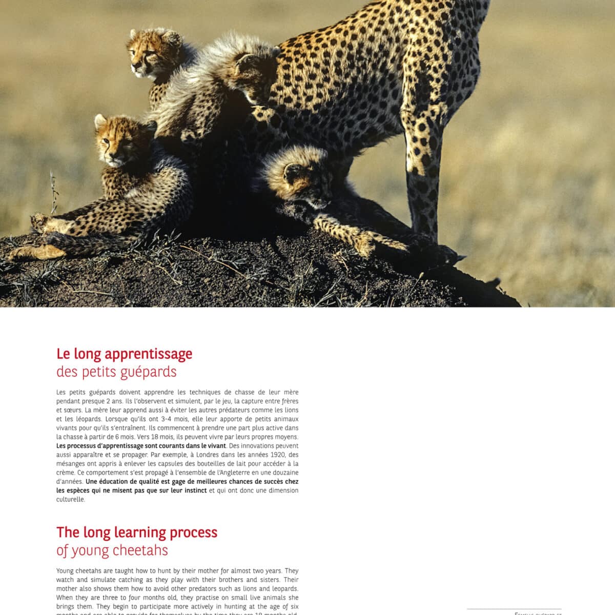 Les petits guépards doivent apprendre les techniques de chasse de leur mère pendant presque 2 ans. Ils l’observent et simulent, par le jeu, la capture entre frères et sœurs. La mère leur apprend aussi à éviter les autres prédateurs comme les lions et les léopards. Lorsque qu’ils ont 3-4 mois, elle leur apporte de petits animaux vivants pour qu’ils s’entraînent. Ils commencent à prendre une part plus active dans la chasse à partir de 6 mois. Vers 18 mois, ils peuvent vivre par leurs propres moyens. Les processus d’apprentissage sont courants dans le vivant. Des innovations peuvent aussi apparaître et se propager. Par exemple, à Londres dans les années 1920, des mésanges ont appris à enlever les capsules des bouteilles de lait pour accéder à la crème. Ce comportement s’est propagé à l’ensemble de l’Angleterre en une douzaine d’années. Une éducation de qualité est gage de meilleures chances de succès chez les espèces qui ne misent pas que sur leur instinct et qui ont donc une dimension culturelle.