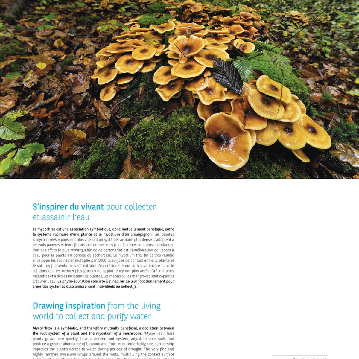 La mycorhize est une association symbiotique, donc mutuellement bénéfique, entre le système racinaire d’une plante et le mycélium d’un champignon. Les plantes « mycorhizées » poussent plus vite, ont un système racinaire plus dense, s’adaptent à des sols pauvres et leurs floraisons comme leurs fructifications sont plus abondantes. L’un des effets le plus remarquable de ce partenariat est l’amélioration de l’accès à l’eau pour la plante en période de sécheresse. Le mycélium très fin et très ramifié enveloppe les racines et multiplie par 1000 la surface de contact entre la plante et le sol. Les filaments peuvent extraire l’eau résiduelle qui se trouve encore dans le sol alors que les racines plus grosses de la plante n’y ont plus accès. Grâce à leurs méandres et à des associations de plantes, les marais ou les mangroves sont capables d’épurer l’eau. La phyto-épuration consiste à s’inspirer de leur fonctionnement pour créer des systèmes d’assainissement individuels ou collectifs.