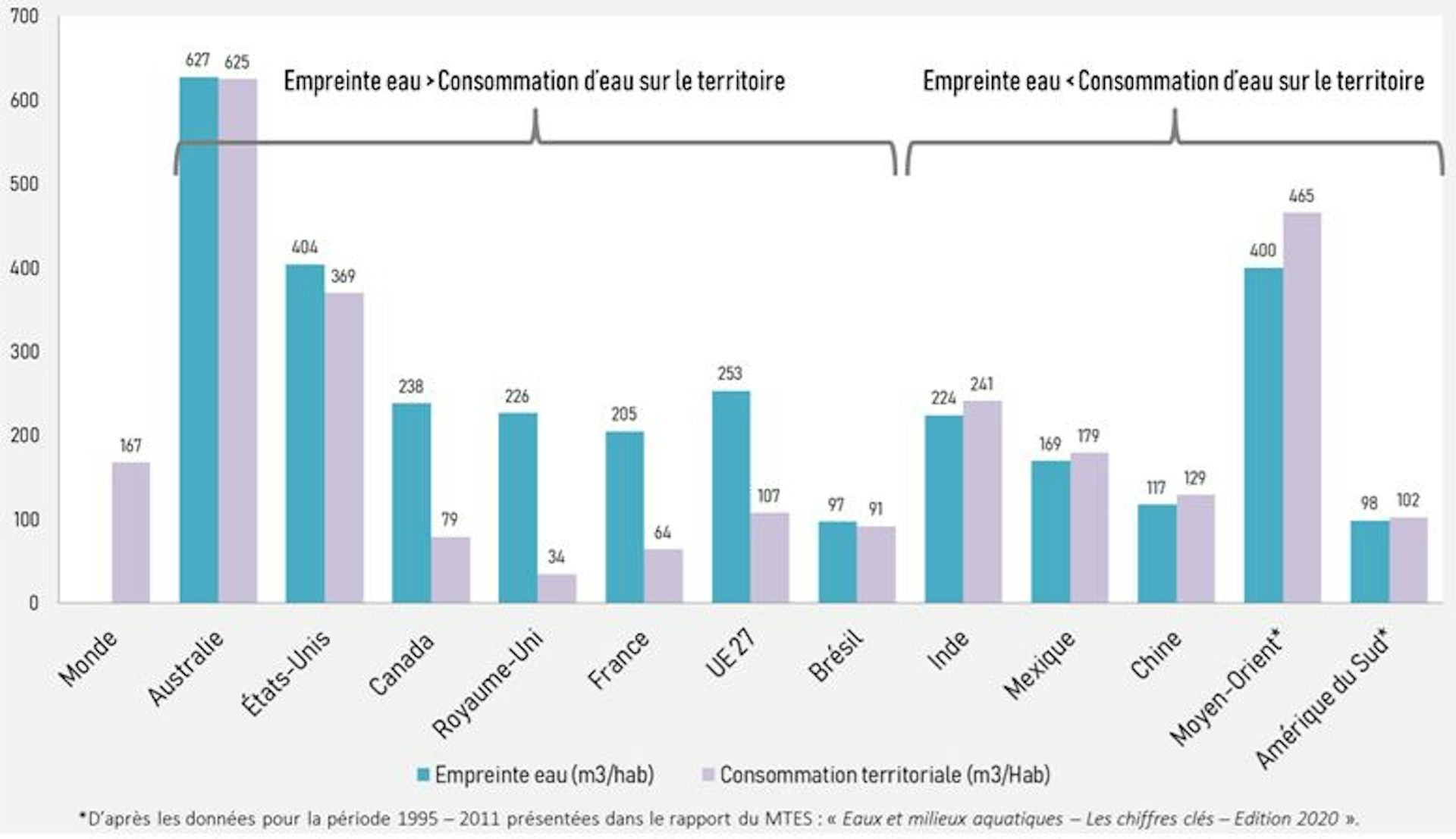 Plus encore, il s’avère que l’empreinte eau française est environ trois fois supérieure au volume d’eau consommé à l’échelle domestique. À l’instar de l’empreinte carbone, une large portion du bilan en eau d’un français vient du fait que la consommation d’eau pour produire les biens et services importés en France est supérieure à celle des biens et services exportés de France.