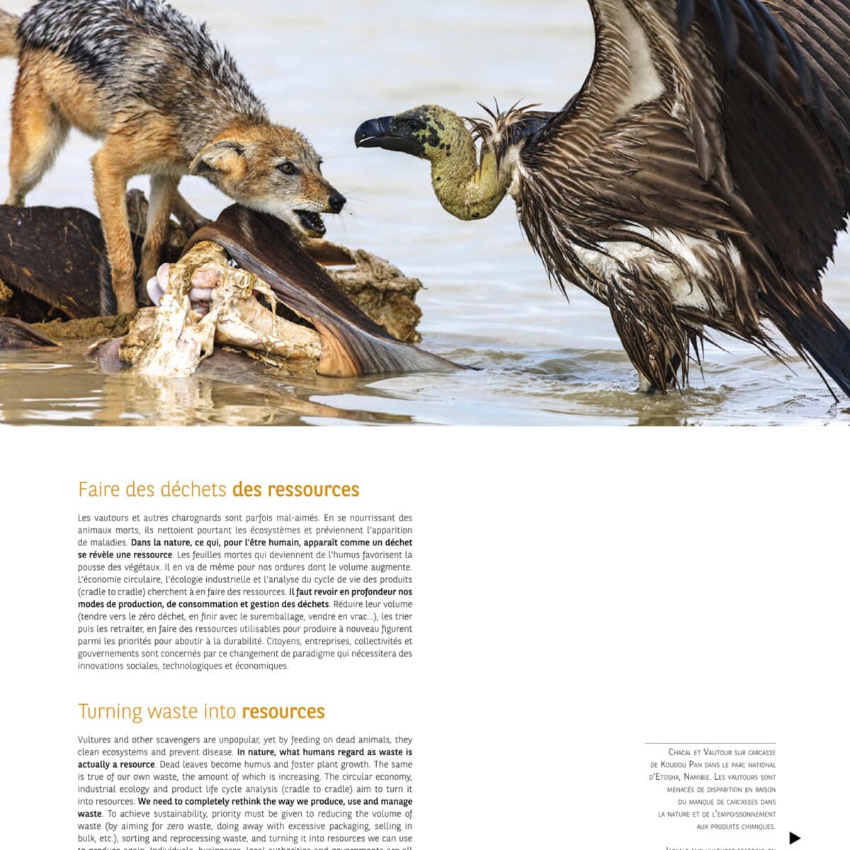 Les vautours et autres charognards sont parfois mal-aimés. En se nourrissant des animaux morts, ils nettoient pourtant les écosystèmes et préviennent l’apparition de maladies. Dans la nature, ce qui, pour l’être humain, apparaît comme un déchet se révèle une ressource. Les feuilles mortes qui deviennent de l’humus favorisent la pousse des végétaux. Il en va de même pour nos ordures dont le volume augmente. L’économie circulaire, l’écologie industrielle et l’analyse du cycle de vie des produits (cradle to cradle) cherchent à en faire des ressources. Il faut revoir en profondeur nos modes de production, de consommation et gestion des déchets. Réduire leur volume (tendre vers le zéro déchet, en finir avec le suremballage, vendre en vrac…), les trier puis les retraiter, en faire des ressources utilisables pour produire à nouveau figurent parmi les priorités pour aboutir à la durabilité. Citoyens, entreprises, collectivités et gouvernements sont concernés par ce changement de paradigme qui nécessitera des innovations sociales, technologiques et économiques.