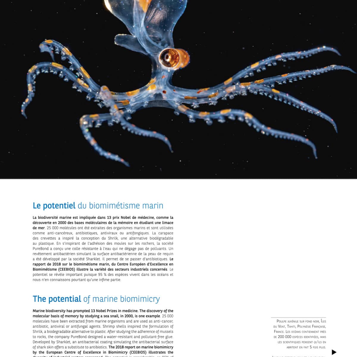 La biodiversité marine est impliquée dans 13 prix Nobel de médecine, comme la découverte en 2000 des bases moléculaires de la mémoire en étudiant une limace de mer. 25 000 molécules ont été extraites des organismes marins et sont utilisées comme anti-cancéreux, antibiotiques, antiviraux ou antifongiques. La carapace des crevettes a inspiré la conception du Shrilk, une alternative biodégradable au plastique. En s’inspirant de l’adhésion des moules sur les rochers, la société PureBond a conçu une colle résistante à l’eau qui ne dégage pas de polluants. Un revêtement antibactérien simulant la surface antibactérienne de la peau de requin a été développé par la société Sharklet. Il permet de se passer d’antibiotiques. Le rapport de 2018 sur le biomimétisme marin, du Centre Européen d’Excellence en Biomimétisme (CEEBIOS) illustre la variété des secteurs industriels concernés. Le potentiel se révèle important puisque 95 % des espèces vivent dans les océans et nous n’en connaissons pourtant qu’une infime partie.