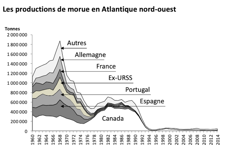 Le plus haut niveau des productions déclarées de morue est atteint en 1968, avec près de 1,9 million de tonnes. Les années suivantes, la production globale ne cesse de décroître, passant sous la barre du million de tonnes en 1973. L’activité reprend lentement au début des années 1980, après l’exclusion des flottilles européennes de la zone de Terre-Neuve. Mais cette reprise est de courte durée. Le 2 juillet 1992, le gouvernement fédéral canadien annonce l’application d’un moratoire sur la pêche à la morue, confirmant le constat de l’effondrement du stock. Cet effondrement en Atlantique nord-ouest est devenu depuis un cas d’école.