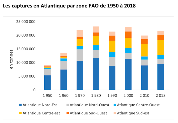 Estimée à 9 millions de tonnes en 1950, la production des produits de la mer en Atlantique atteint 21 millions de tonnes en 1970, puis dépasse les 23 millions de tonnes en 1980 et 2000. Les captures en 2018 approchent les 22 millions de tonnes. La production globale reste ainsi stable depuis 1970, avec un rendement maximal autour de 20 millions de tonnes sur un demi-siècle.
