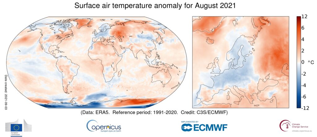 Le mois d’août 2021 a été, avec le mois d’août 2017, parmi les trois mois les plus chauds sur la période 1991-2020 à l’échelle mondiale. En Europe, la température du mois d’août 2021 a été proche de la moyenne. Cependant, il y a eu de grandes disparités sur le continent : des températures maximales record dans les pays méditerranéens, des températures plus chaudes que la moyenne dans l’Est et des températures généralement inférieures à la moyenne dans le nord.