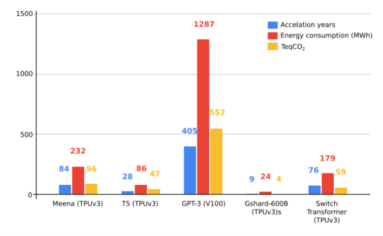 Quelques facteurs d’énergie utilisés pour l’entraînement de plusieurs réseaux de neurones modernes (ici pour le traitement du langage). Nombre d’années équivalent-GPU (bleu), facture électrique en MWh (pour information, 1MWh équivaut environ à 100 heures) en rouge, et tonnage équivalent en CO₂ (pour information, 1TeqCO2 équivaut à 1 A/R Paris-New York), en jaune. Le simple coût d’entraînement d’un réseau de neurones sur une application ciblée est 250 fois supérieur au maximum annuel autorisé à chaque Européen (2TeqCO2) pour atteindre l’équilibre carbone en 2050.