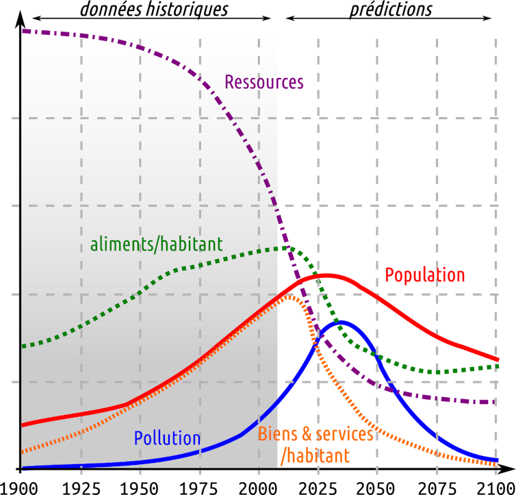 Le modèle « World3 » dans le scénario « business as usual ». Construites en 1972, ces prédictions sont encore correctes en 2021. Il prévoit un effondrement de la population induit, par l’augmentation d’une pollution devenue impossible à endiguer et qui, par manque de ressources, domine la production de biens et services puis la production alimentaire (elle-même affectée fortement par la pollution et l’érosion des sols). Le manque d’équipement et les famines font alors basculer la mortalité et effondrent la population.