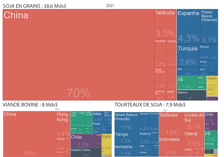 Or, vu du Brésil, on peut questionner cette évaluation. L’Europe n’est importatrice que de 14 % du soja brésilien et 8,8 % de la viande bovine brésilienne (données COMEXSTAT) – comme le montre le graphique ci-dessus –, les deux productions qui sont les grands vecteurs de déforestation (en Amazonie ou dans les autres régions du Brésil).