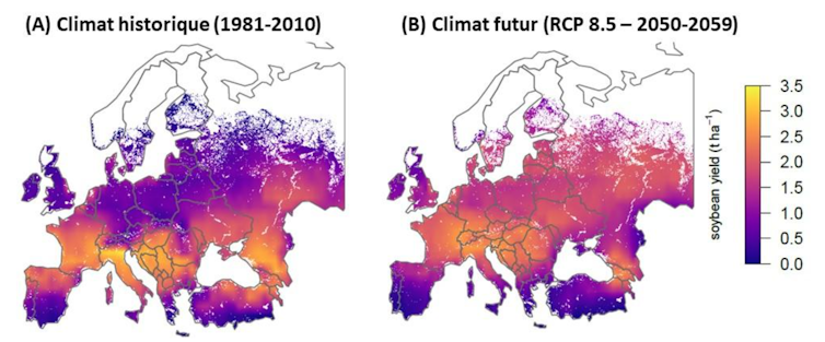 La capacité du continent européen à devenir autosuffisant en soja ne devrait pas être remise en cause avec l’évolution du climat. Selon nos modèles d’estimation du rendement du soja en Europe, le continent pourrait atteindre une autosuffisance de 50% à 100% d’ici à 2050 si 4% à 11% des terres cultivées européennes étaient consacrées au soja.