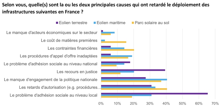 Pour les experts interrogés, les raisons de ce retard sont multiples : les procédures et demandes d’autorisations pour les projets d’EnR sont très longues ; les politiques nationales sur les renouvelables manquent d’engagement ; surtout, les nouveaux projets – éoliens en particulier – provoquent localement des levées de boucliers.