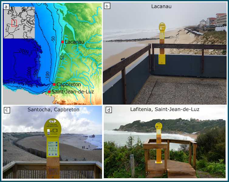 Trois sites pilotes de la côte de Nouvelle-Aquitaine ont été sélectionnés pour l’installation d’un poste d’observation. L’un à Lacanau (Gironde), l’autre à Capbreton (Landes) et le dernier à Saint-Jean-de-Luz (Pyrénées-Atlantiques). Ces lieux sont implantés dans chaque département de l’ex-région Aquitaine et présentent des sites aux environnements et problématiques d’érosion différents. L’objectif est d’aménager dans les mois à venir de nouveaux postes dans la région, notamment en Charente-Maritime.