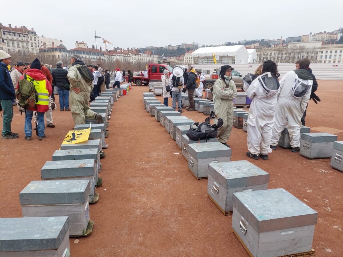 Les apiculteurs du Rhône et des départements alentours ont mené en plein centre de Lyon une spectaculaire opération de sensibilisation aux difficultés rencontrées par la filière. Lundi 5 février au matin, une cinquantaine d’apiculteurs ont installé pour quelques heures près de 500 ruches place Bellecour à Lyon.