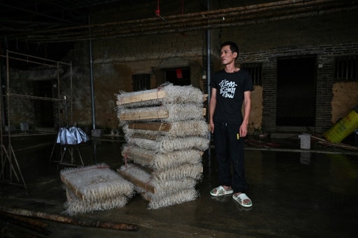 Qingyuan (Chine) (AFP) – Jet d’eau en main, Zhu Huangyi, 40 ans, nettoie le petit local en béton où grandissaient ses vers à soie, dont les deux tiers ont été emportés par les inondations qui frappent le sud de la Chine.