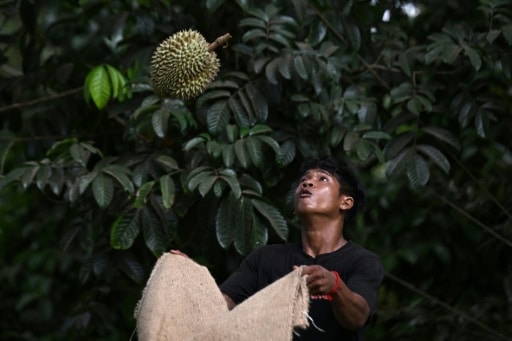 Chanthaburi (Thaïlande) (AFP) – Escaladant l’arbre sur une quinzaine de mètres, la sueur coulant dans ses yeux, le cueilleur de durians coupe d’une main experte la queue du fruit qu’il envoie dans les bras de son collègue au sol.