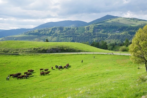 En ce lundi de mai ensoleillé sur le versant alsacien du massif des Vosges, plusieurs dizaines de vaches au pelage marron pour la plupart grimpent à travers la forêt, en n’oubliant pas de s’échapper quelques instants pour aller boire dans un ruisseau en contrebas.