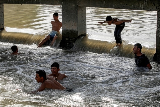 Bagdad (AFP) – Quasi-quotidiennement, l’Irakien Moussa Abdallah, peintre en bâtiment, vient se baigner dans le fleuve à Bagdad, petite parenthèse de fraîcheur pour oublier les délestages électriques à la maison et l’eau pratiquement bouillante qui coule de ses robinets, en plein été caniculaire.