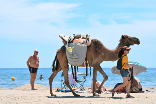 Frontignan (France) (AFP) – Sous un soleil de plomb, deux dromadaires, Lili et Touareg, sillonnent la plage, à Frontignan (Hérault): sacs accrochés sur le dos, ils sont en quête de déchets à récupérer auprès des vacanciers, surpris de croiser un tel animal loin des déserts africains.