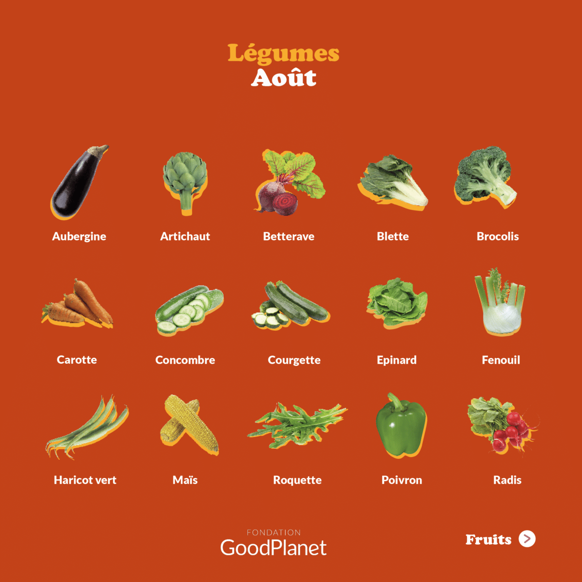 Bonne nouvelle : de nombreux fruits et légumes sont de saison en août. En effet, tout au long de ce mois d’été, vous pourrez entre autres retrouver courgettes, concombres, aubergines, carottes et radis sur les étals de vos marchés. Du côté des fruits, les melons, les fraises et les tomates sont toujours de saison. Profitez de tous ces fruits et légumes gorgés d’eau pour hydrater votre corps via l’alimentation. Une salade rafraîchissante, qu’elle soit salée ou sucrée, est toujours grandement appréciée lors des périodes de fortes chaleurs. Si vous manquez d’inspiration, la Fondation GoodPlanet a rédigé le livre BON qui comprend plus de 180 recettes gourmandes pour vous aider à trouver de l’inspiration, tout en repensant l’alimentation à la lumière des enjeux environnementaux.