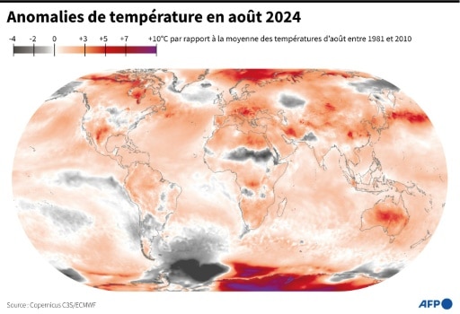 Paris – L’été 2024 a été le plus chaud jamais mesuré sur la planète, où les records des températures s’enchaînent sans faiblir depuis plus d’un an, avec son cortège de canicules, de sécheresses ou d’inondations meurtrières alimentées par un réchauffement climatique sans répit.