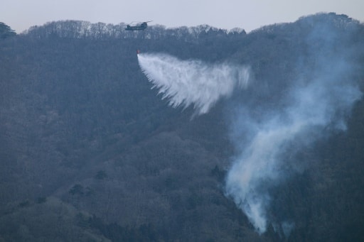 Seize hélicoptères, y compris ceux des forces d’autodéfense, ont également fait la navette pour verser de l’eau sur les flammes.
