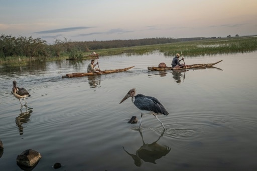 Tous les matins, avant que le cagnard ne frappe, de nombreux pêcheurs rament sur le lac pour remonter leurs filets, au milieu d’une faune extrêmement riche, où hippopotames cohabitent avec canards et autres marabouts, de grands oiseaux.