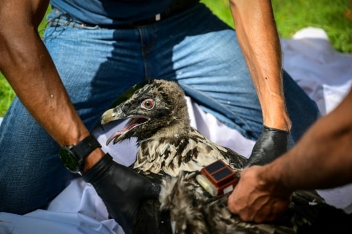 Sur l’herbe, Pascal Orabi, le coordinateur en France du programme européen LIFE Gyp’Act, tient fermement l’animal: deux bagues clipsées aux pattes, un boîtier GPS sur le dos et un coup de pinceau de décolorant sur quelques plumes.