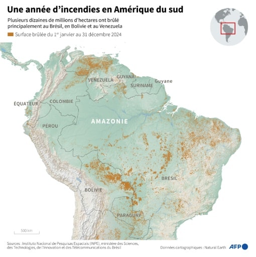 Rio de Janeiro (Brésil) (AFP) – Les feux de forêt historiques qui ont touché le Brésil en 2024 ont atteint en Amazonie une surface plus de deux fois supérieure à la moyenne des quarante dernières années, selon une étude publiée mardi par le réseau de surveillance MapBiomas.