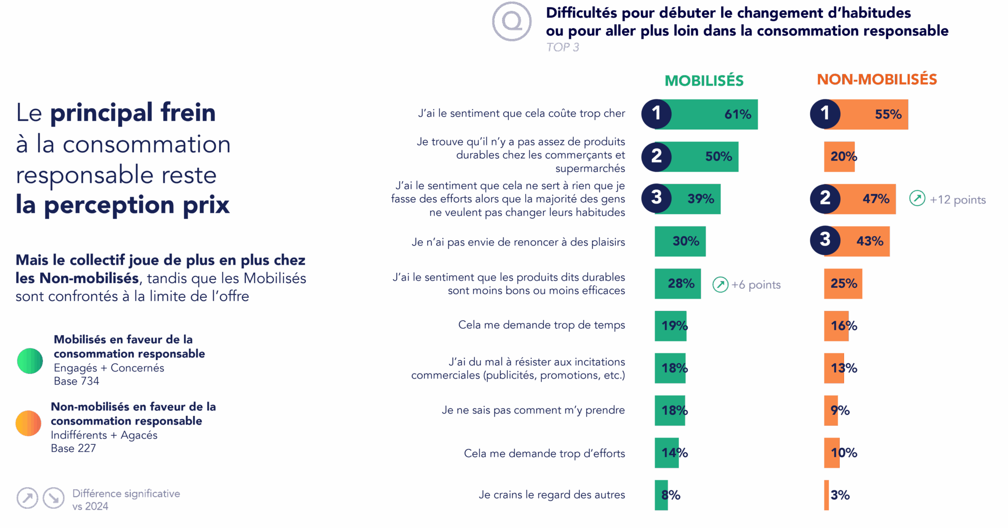 Bien qu’il y ait une demande forte pour des alternatives en termes de consommation, l’offre responsable reste perçue comme chère par plus de la moitié des Français, qu’ils soient (61 %) ou non mobilisés (55 %) sur la thématique environnementale. De ces résultats transparait aussi le manque d’une offre clairement identifiée dans laquelle avoir confiance. Enfin, plus du tiers des Français peinent à s’engager, estimant la portée de ses actions limitées si le reste des concitoyens ne suit pas le mouvement.