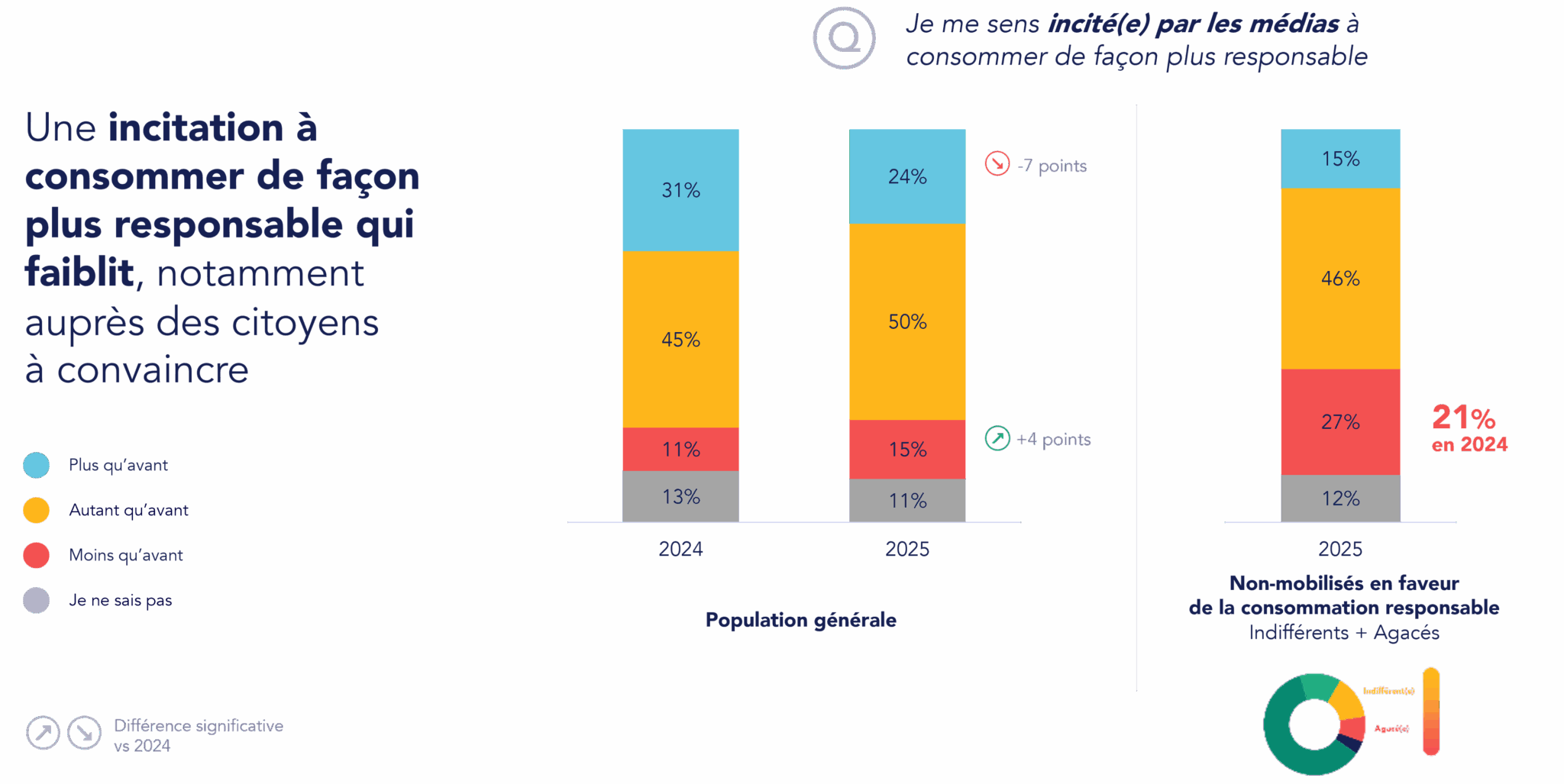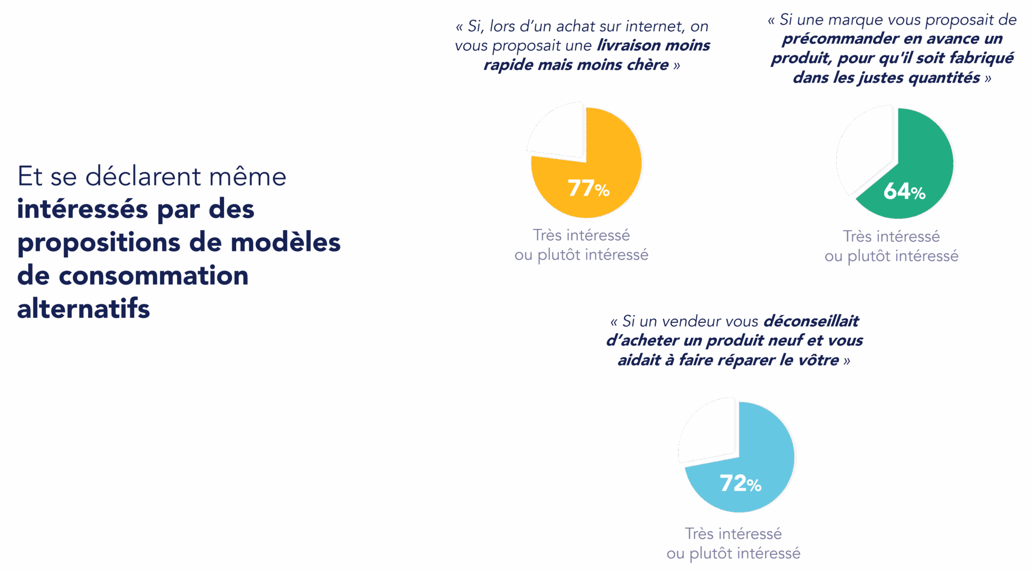 Malgré un certain recul, l’idée de la consommation responsable progresse dans les esprits puisque 9 personnes sur 10 affirment s’interroger sur l’utilité de leurs achats avant de les effectuer. Les auteurs du baromètre mettent également en avant le fait que des alternatives pour sortir de la surconsommation seraient appréciées par la population : « plus de 7 citoyens sur 10 se montrent ouverts aux propositions de modèles de consommation alternatifs, comme le choix d’une livraison moins rapide mais moins chère (77 % d’intéressés), ou le fait qu’un vendeur déconseille l’achat d’un produit neuf au profit de la réparation de l’ancien (72 % d’intéressés). »