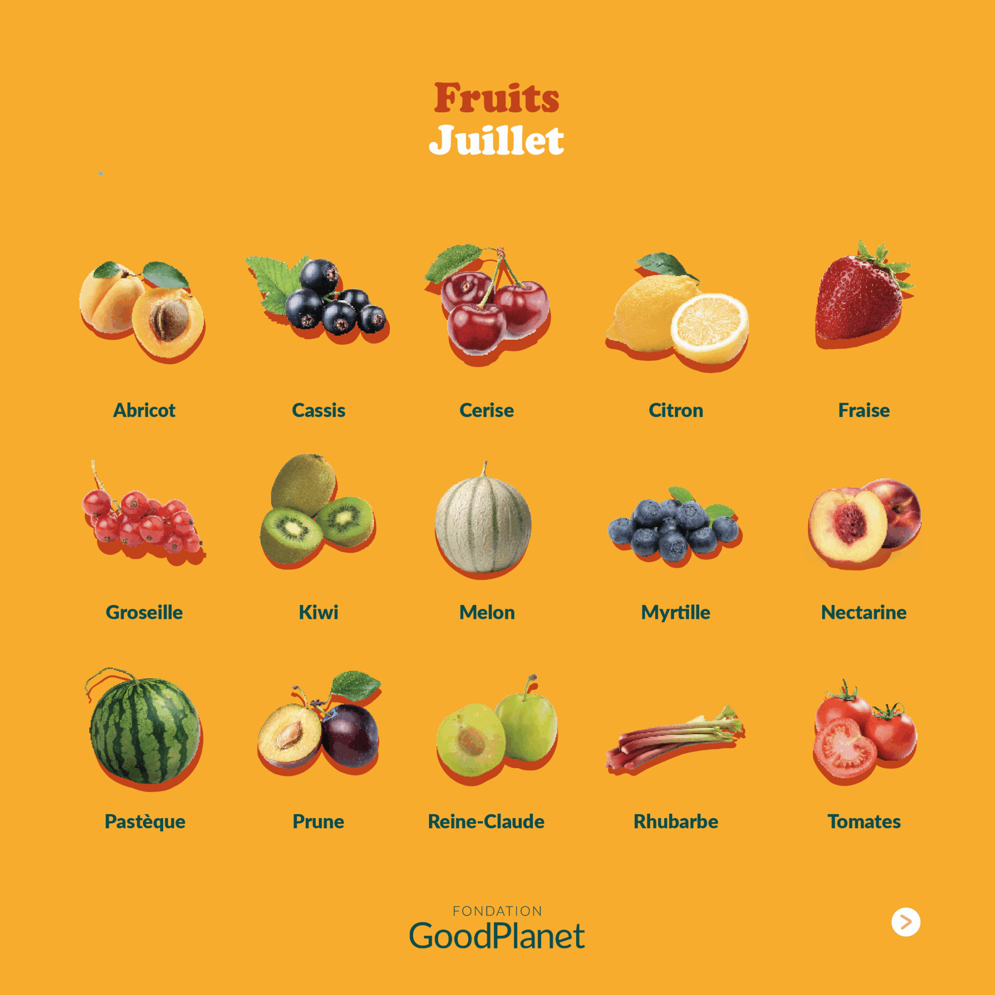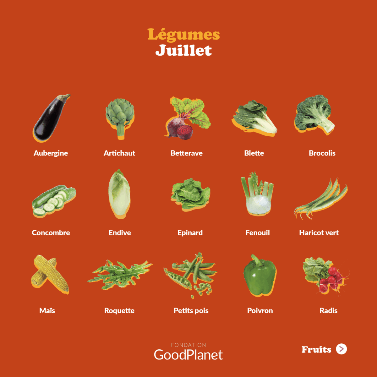 L’été est là, avec sa chaleur, ses saveurs et nos envies de fraicheur. Heureusement, les fruits et légumes de juillet sont là eux aussi. Ils témoignent de la richesse de ce que la nature offre pour nous nourrir et régaler nos papilles. Découvrez les fruits et légumes de saison grâce au calendrier proposé chaque mois par la Fondation GoodPlanet.
