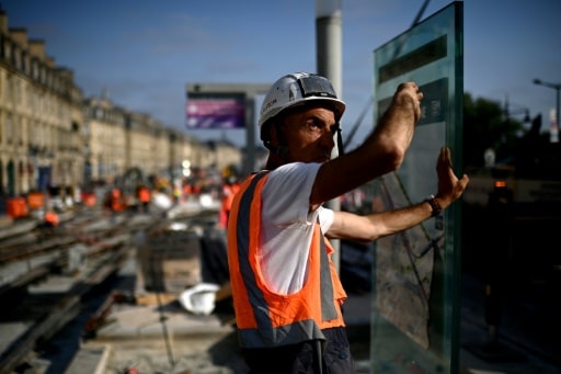 Un ouvrier qui travaille sur un chantier de lignes de tramway le long de la Garonne se protège du soleil pendant une vague de chaleur à Bordeaux, dans le sud-ouest de la France, le 1er juillet 2025 © AFP/Archives Christophe ARCHAMBAULT