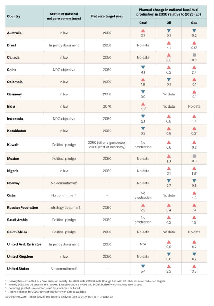 Les enjeux climatiques ne font pas partie pour l’instant des priorités des gouvernements de ces pays. Les scénarios actuels de production de combustibles fossiles pour 2050 sont 4,5 fois supérieure aux volumes à respecter pour cantonner le réchauffement à 1,5 °C et 2,5 fois supérieure aux niveaux compatibles avec une limite de 2 °C.