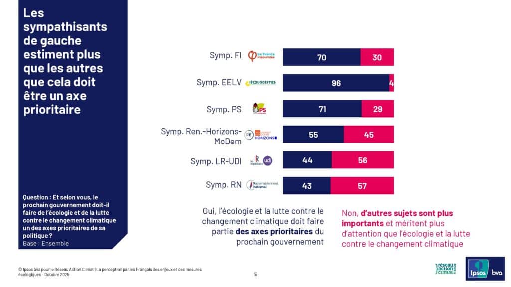 La priorité accordée à l’écologie dans l’ensemble de la population française selon les sensibilités politiques par rapport à d’autres sujets – extrait du sondage La perception par les Français des enjeux et des mesures écologiques du Réseau Action Climat