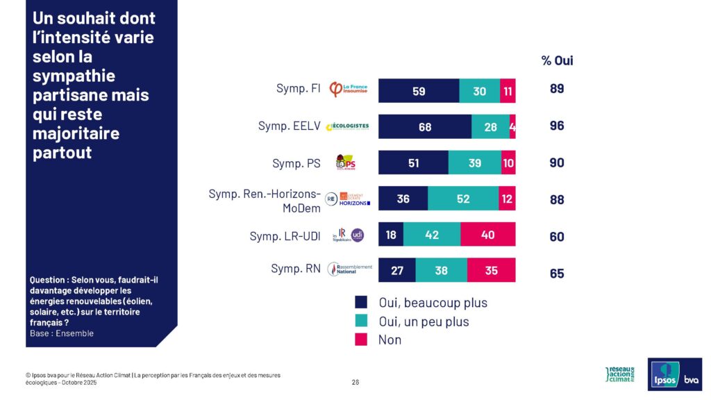 Le soutien des Français aux énergies renouvelable en fonction de leur sensibilité politique – extrait du sondage La perception par les Français des enjeux et des mesures écologiques du Réseau Action Climat