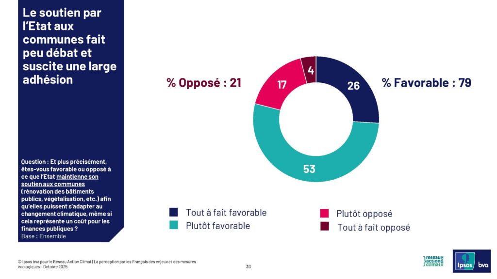 Le soutien aux mesures environnementales est également massif, surtout quand elles concernent le quotidien. Par exemple 79 % des Français affirment être « pour un soutien par l’Etat des communes (rénovation des bâtiments publics, végétalisation, etc.) afin qu’elles puissent s’adapter au changement climatique, même si cela représente un coût pour les finances publiques ».