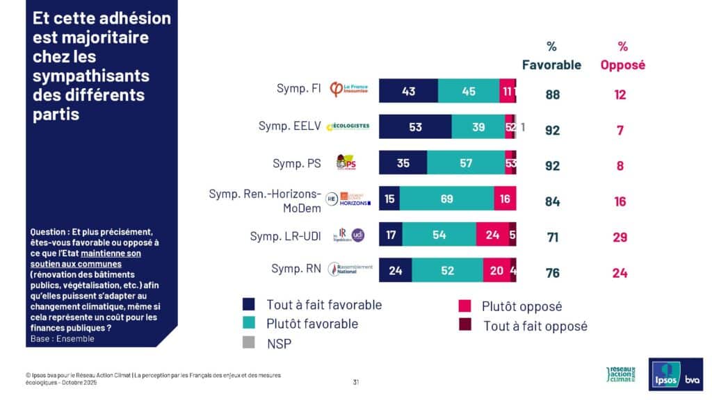 Les attentes des Français à la question du soutien de l’État aux communes pour la transition écologique selon leur appartenance politique – extrait du sondage La perception par les Français des enjeux et des mesures écologiques du Réseau Action Climat
