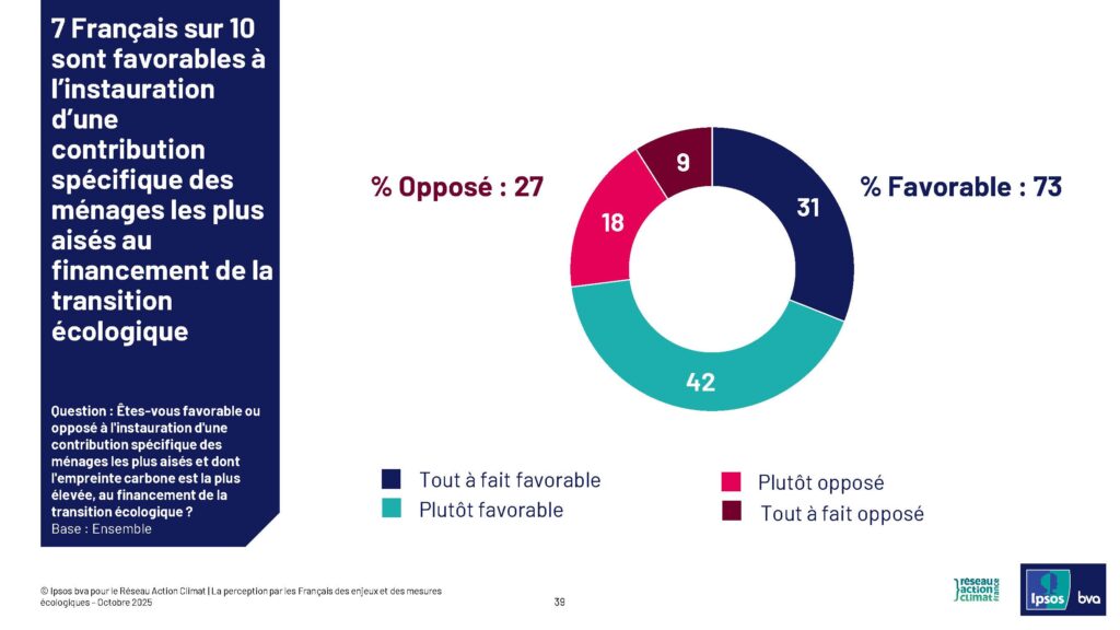 Les répondants ont bien conscience du coût de la transition. Leurs réponses à des mesures testées par le sondage traduisent aussi des demandes en matière de justice sociale et fiscale afin d’en payer la mise en œuvre. Il s’agit également d’une question de répartition de la charge de l’effort et donc d’une forme de redistribution. Une majorité de Français exprime, mais à des degrés divers selon leur sensibilité politique, une demande de justice. 73 % des sondés se montrent favorables à « l’instauration d’une contribution spécifique des ménages les plus aisés et dont l’empreinte carbone est la plus élevée, au financement de la transition écologique ».