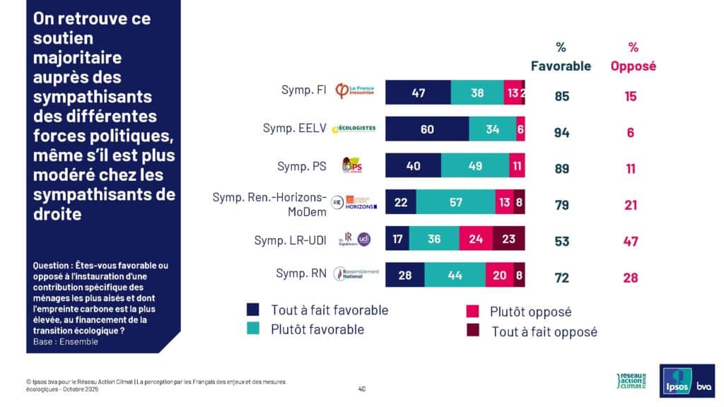 Le soutien des Français à une fiscalité écologique plus forte pour les plus aisés afin de financer la transition selon leur affiliation politique – extrait du sondage La perception par les Français des enjeux et des mesures écologiques du Réseau Action Climat