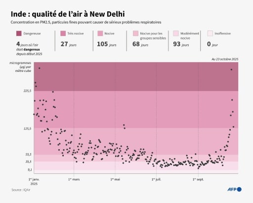 Vendredi matin, les concentrations de PM2.5 étaient dans certaines parties de New Delhi, 24 fois supérieures au seuil fixé par l’OMS, selon IQAir.